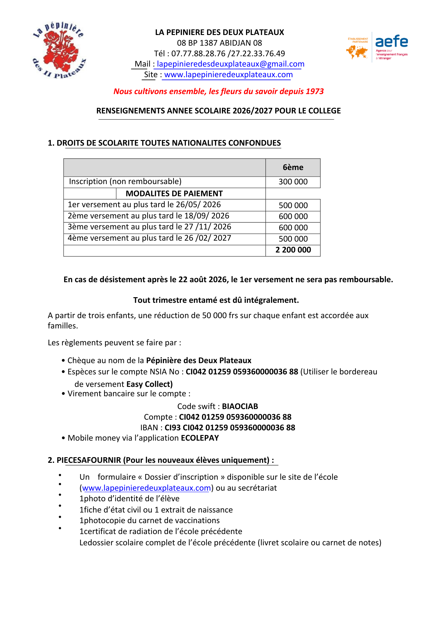 (+225) 27 22 33 76 49 / 07 77 88 28 76lapepinieredesdeuxplateaux@gmail.comLundi au Vendredi: 8:00 - 17H