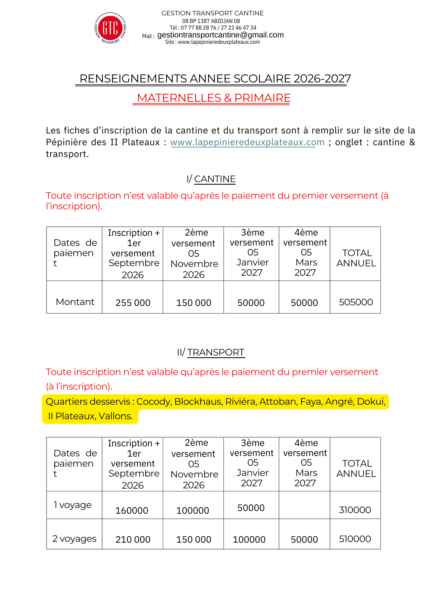 Tarifs Cantine et transport primaire 2026-2027